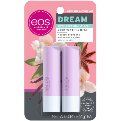 LIP BALM- Dream - Leite Quente de Baunilha. Os protetores labiais com sabor eos com Manteiga de Karité natural são incrivelmente hidratantes e estão disponíveis em sabores inspirados no bem-estar e no bem-estar!